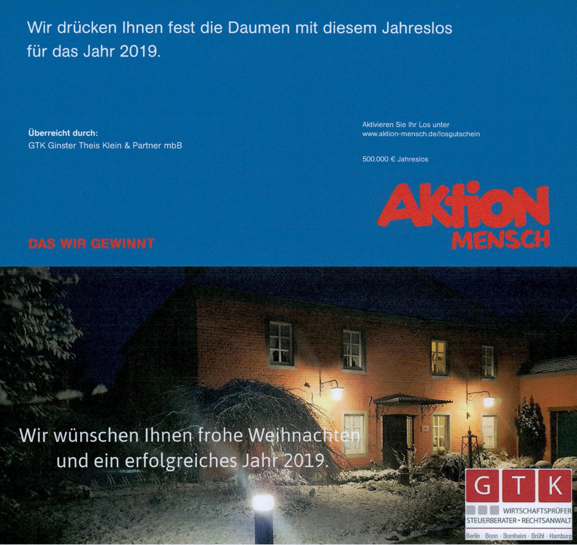 Als kleinen Dank für die erfolgreiche Zusammenarbeit bekamen alle Mitarbeiter im Rahmen der Weihnachtsfeier der GTK Wirtschaftsprüfer • Steuerberater • Rechtsanwalt ein Jahreslos der Aktion Mensch durch die Partner überreicht.