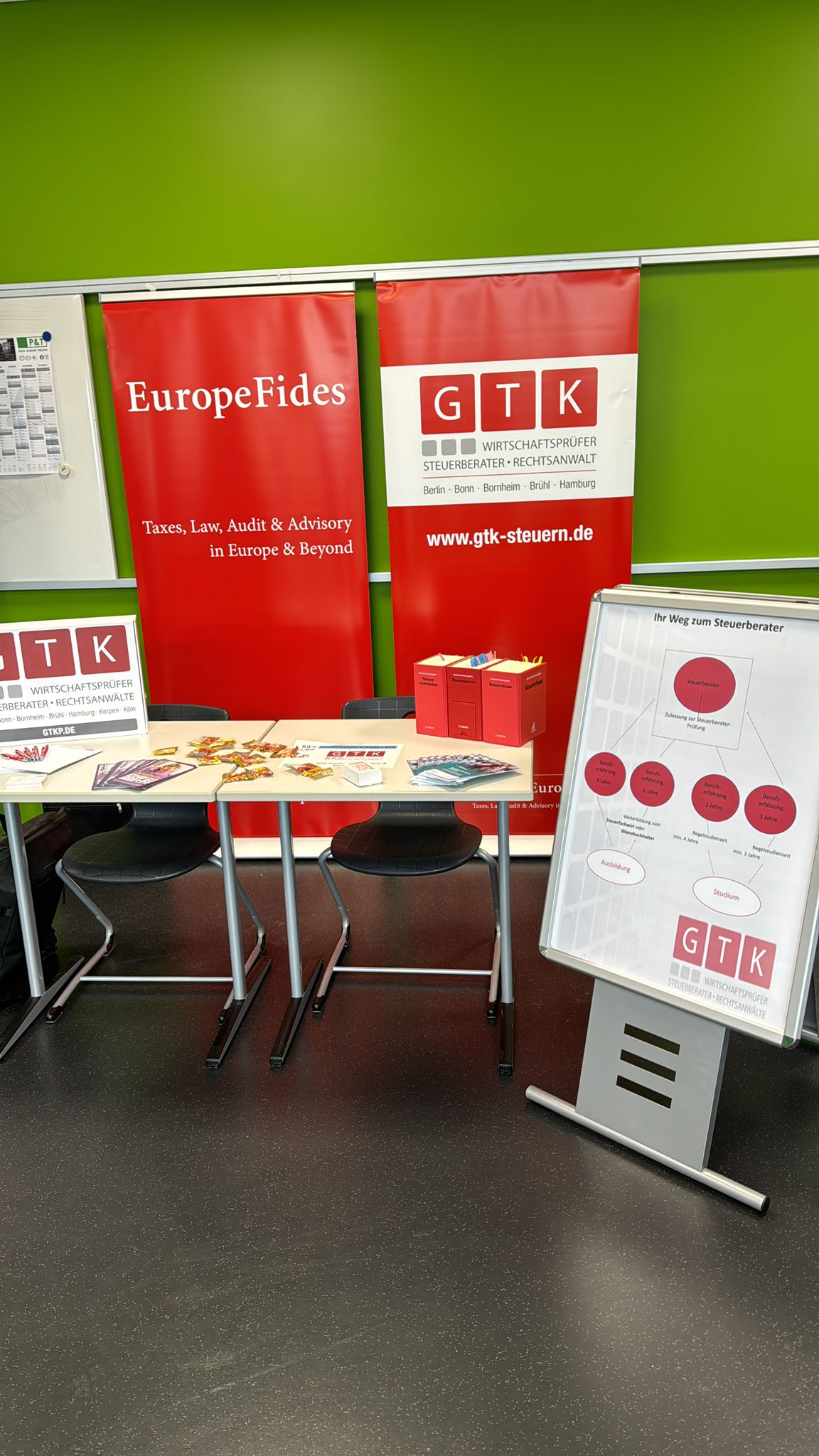 Am 24. September 2024 hatte die GTK aus Bonn die Möglichkeit, sich auf der Praktikums- und Ausbildungsmesse „MATCH! Die etwas andere Messe!“ im Robert-Wetzlar-Berufskolleg mit einem eigenen Stand zu präsentieren. Zwischen 9:00 und 14:00 Uhr informierten die Berater von GTK interessierte Schülerinnen und Schüler über die vielfältigen Ausbildungsmöglichkeiten zum/zur Steuerfachangestellten bei der GTK. Neben allgemeinen Informationen zur Ausbildung gab es umfassende Einblicke in den Arbeitsalltag eines Steuerfachangestellten sowie die Karrieremöglichkeiten in diesem Berufsfeld.