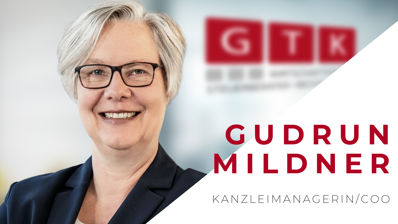 Zum 01.01.2021 konnte die GTK Frau Gudrun Mildner, Diplom-Ökonomin, als Kanzleimanagerin gewinnen. Sie wird eine zentrale Rolle in der Weiterentwicklung der GTK in den Bereichen internes Projekt- und Personalmanagement, Recruiting und Digitalisierung spielen.