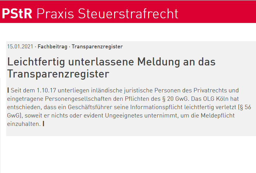 Leichtfertig unterlassene Meldung an das Transparenzregister - Fachbeitrag