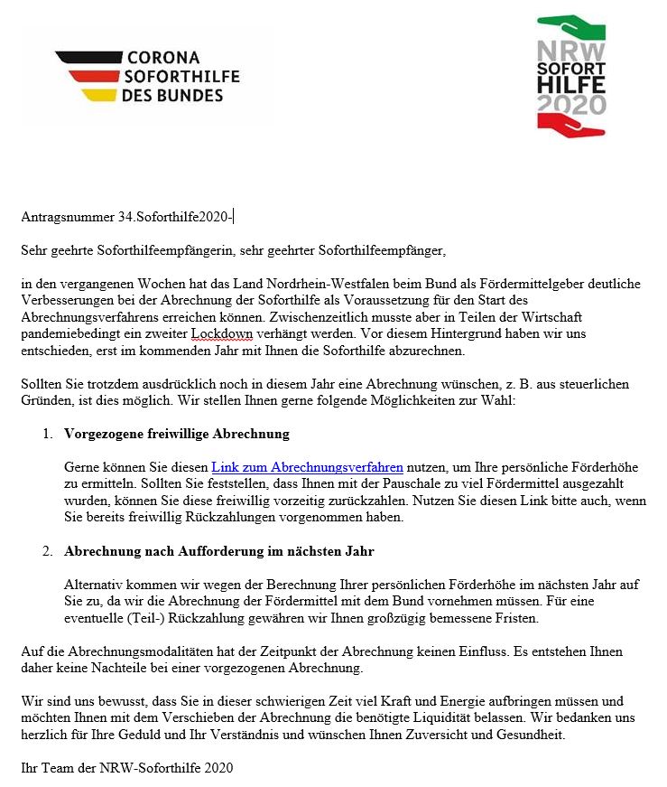 Rückzahlung Soforthilfe NRW freiwillig noch in diesem Jahr möglich