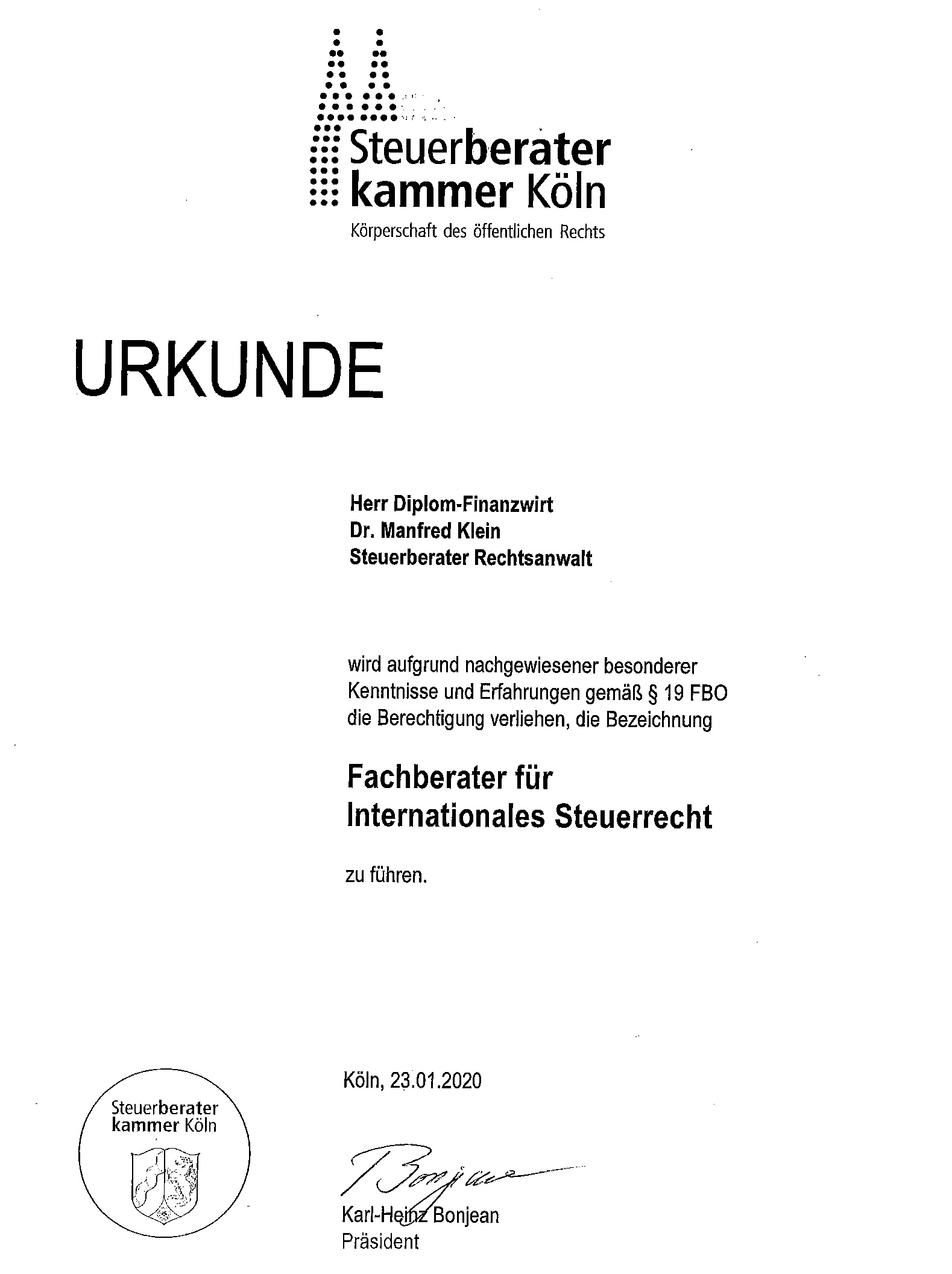 Herrn Prof. Dr. Manfred Klein wurde am 23.01.2020 durch die Steuerberaterkammer Köln zum Fachberater für internationales Steuerrecht bestellt.