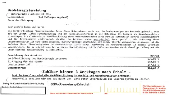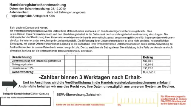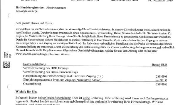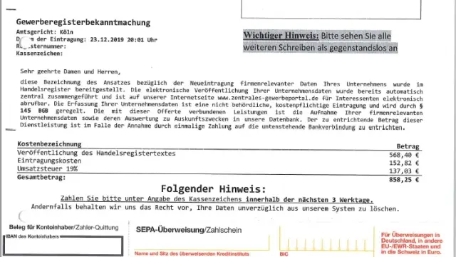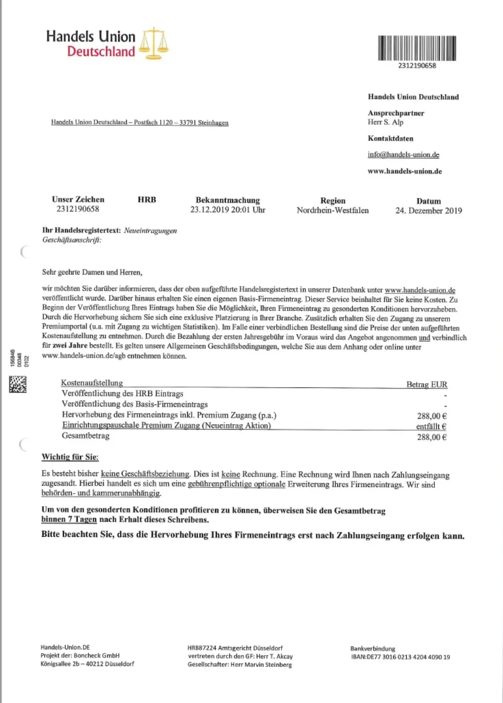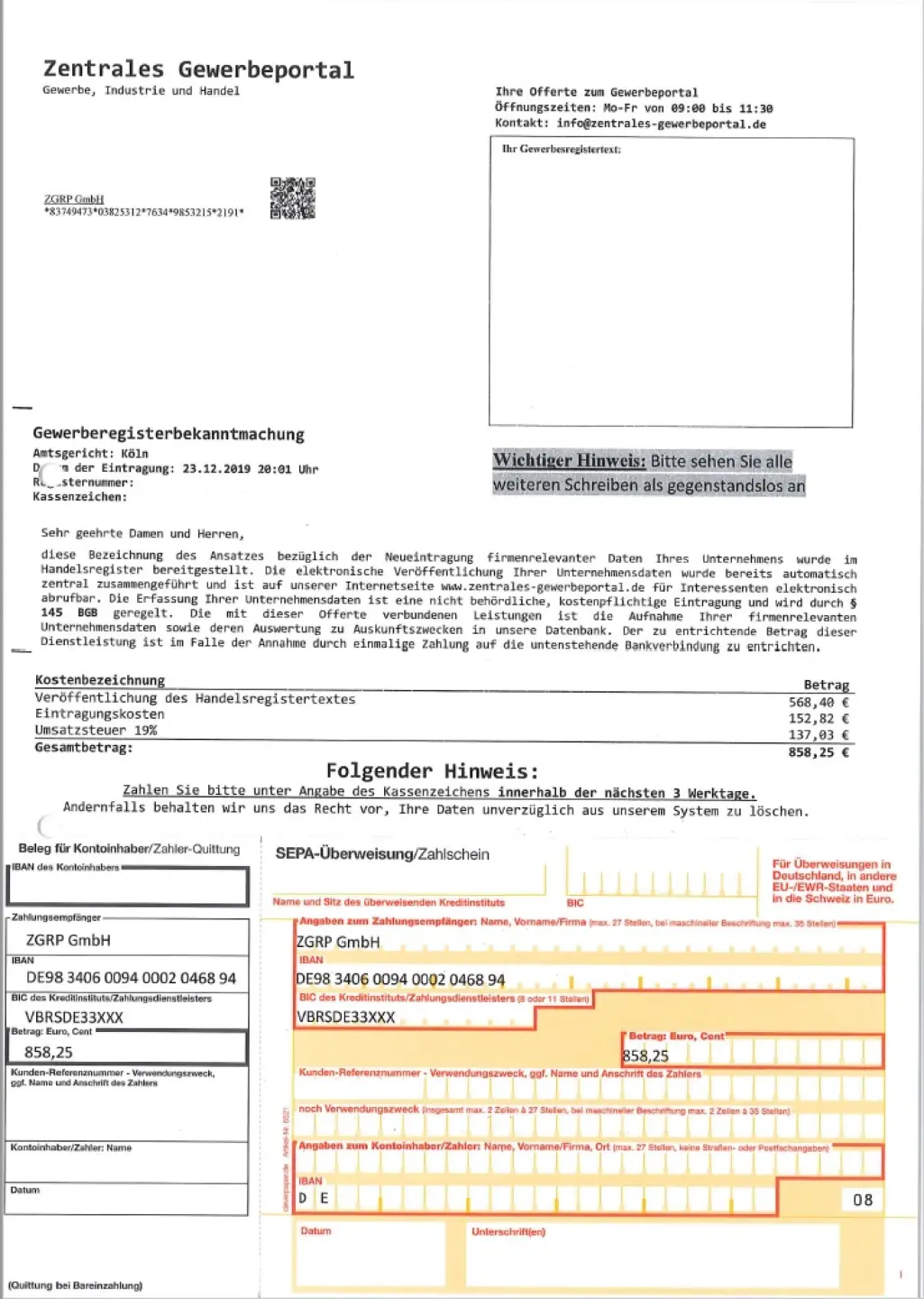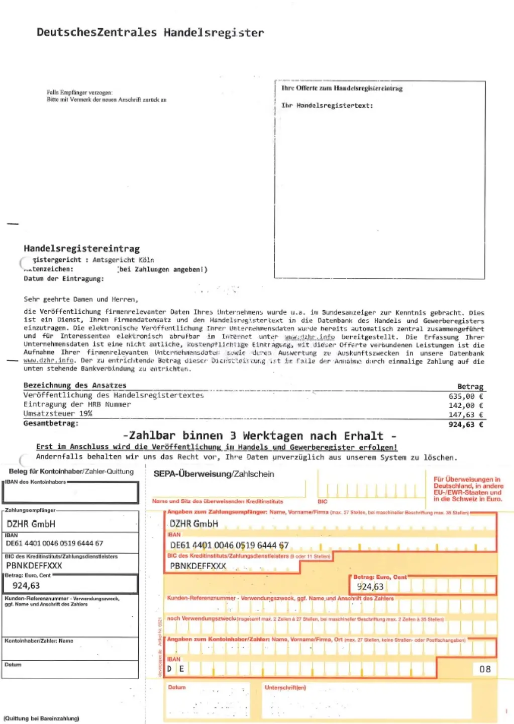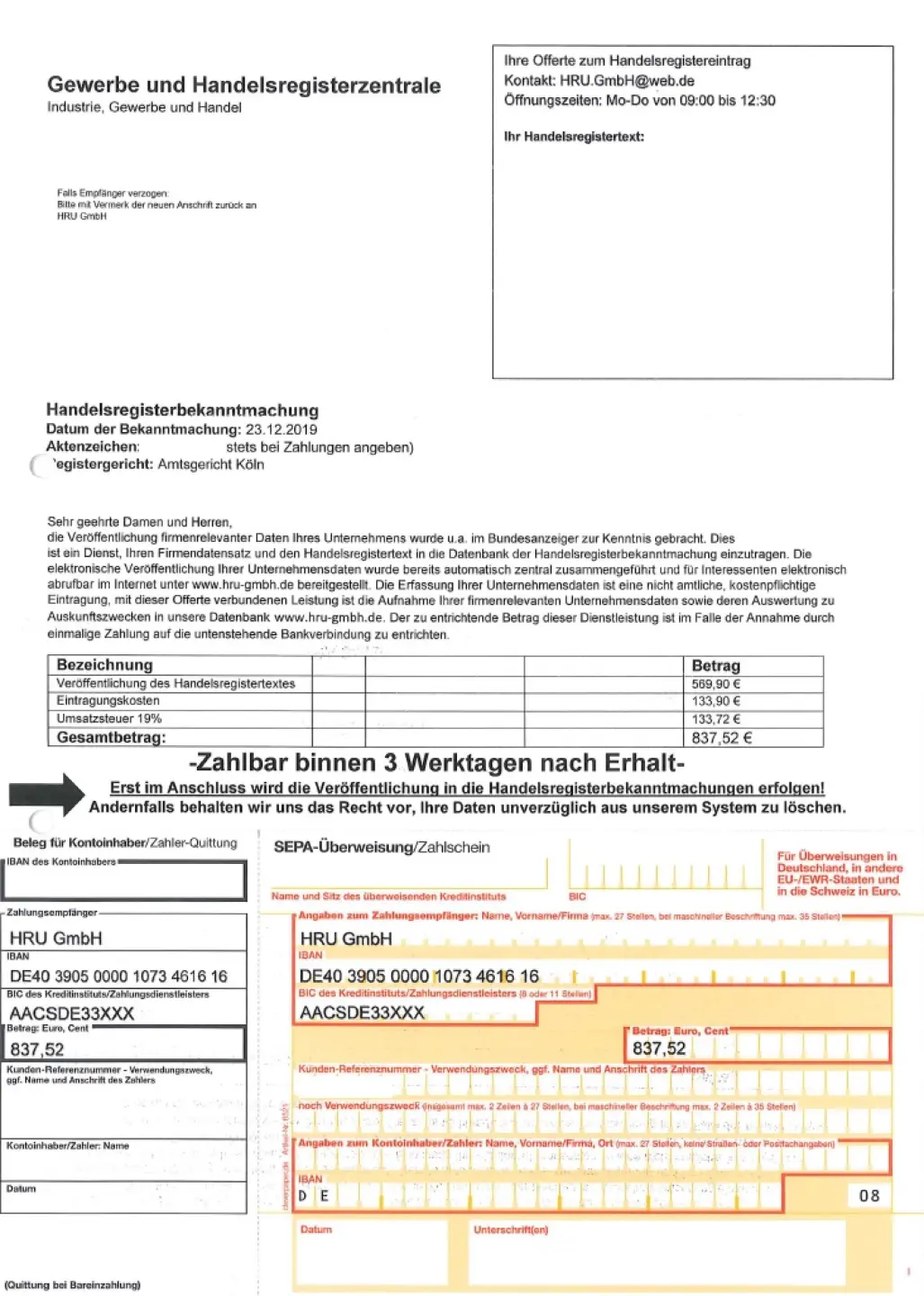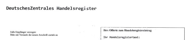Sie erhalten hier als Unternehmer entsprechende Schreiben, welche den Anschein erwecken, von offiziellen Ämtern ausgestellt zu sein. Diese sind mit Zahlungsaufforderungen von bis zu 1.000,00 EUR für die Veröffentlichung des Eintrags im Handelsregister verbunden.