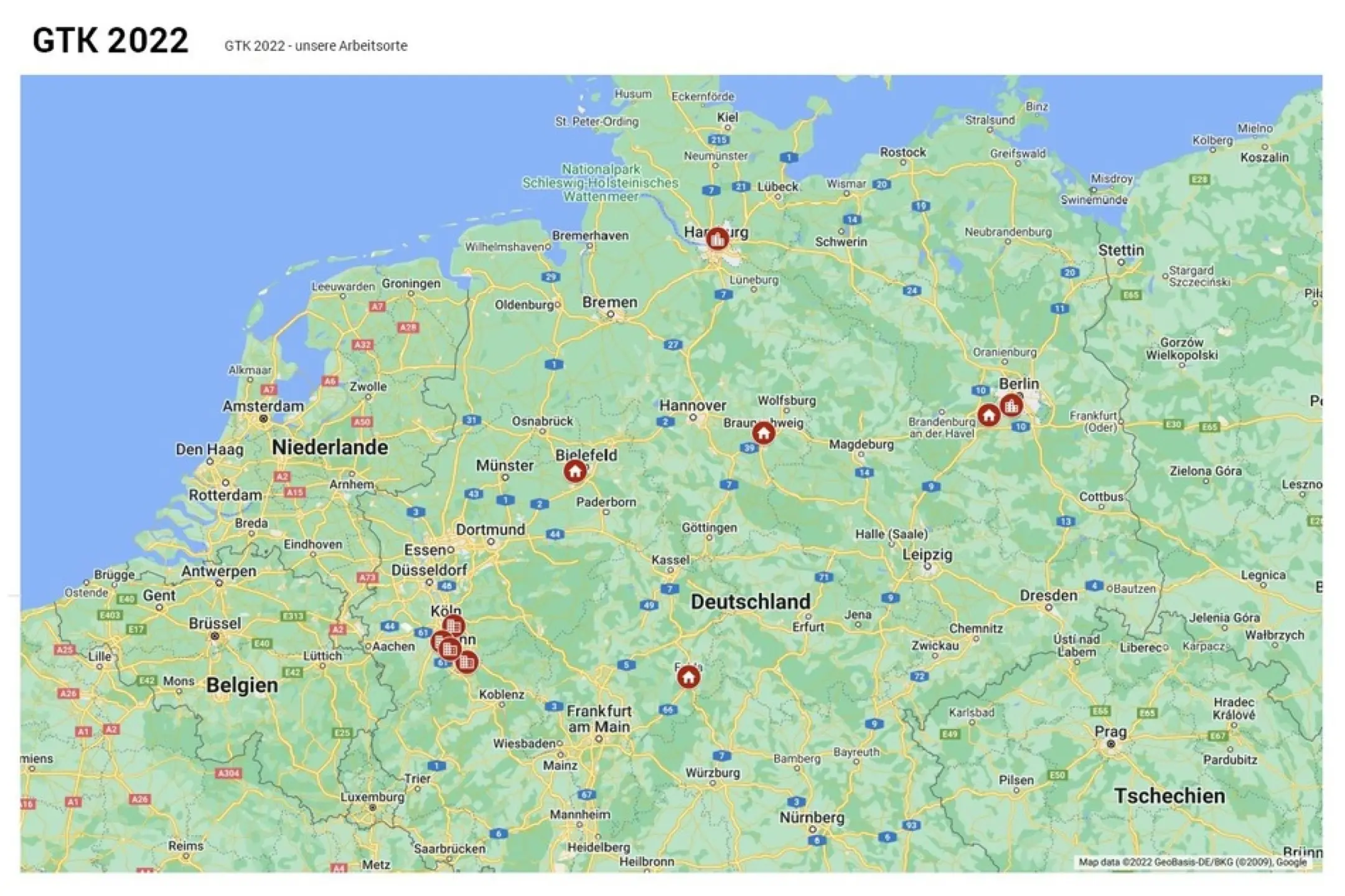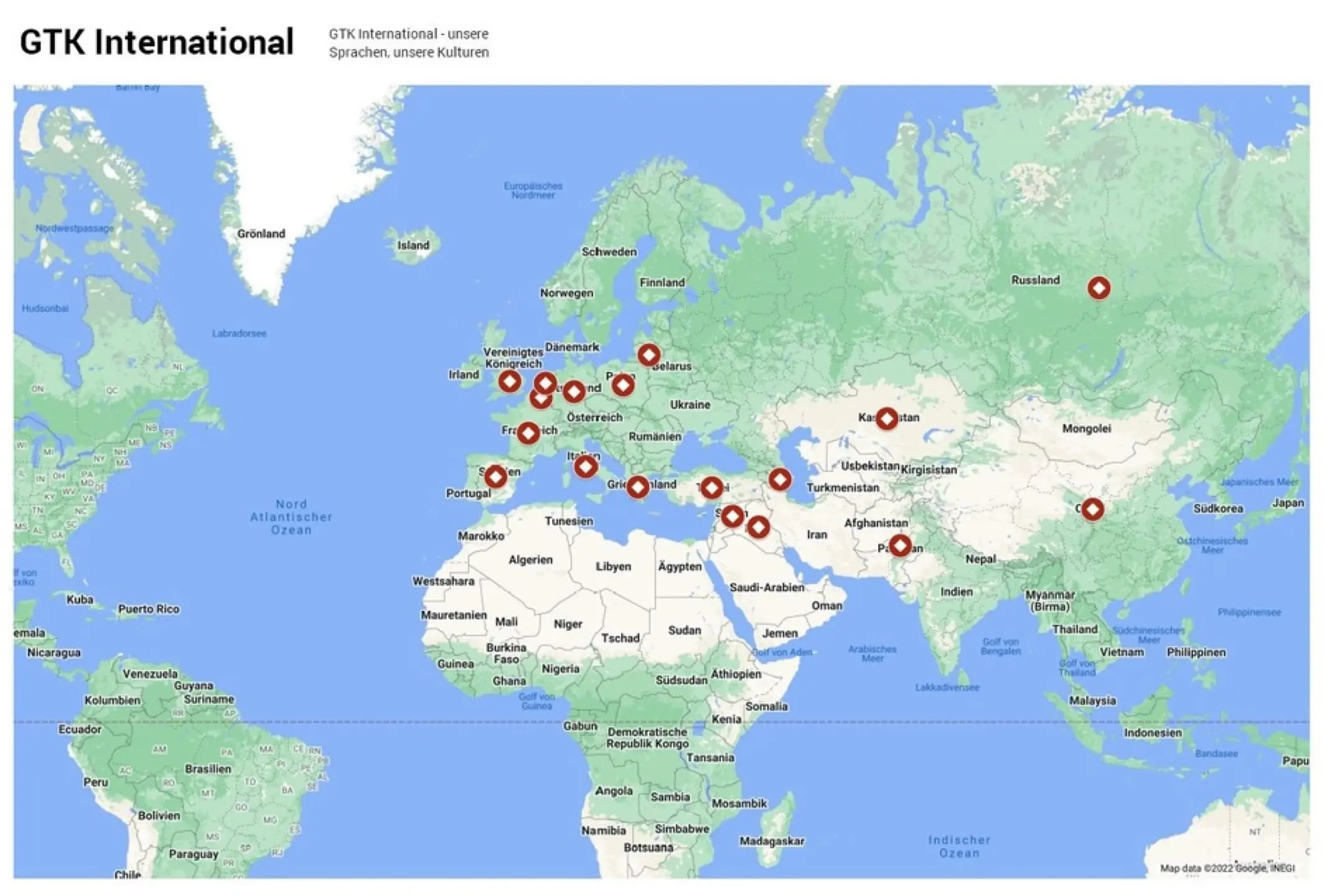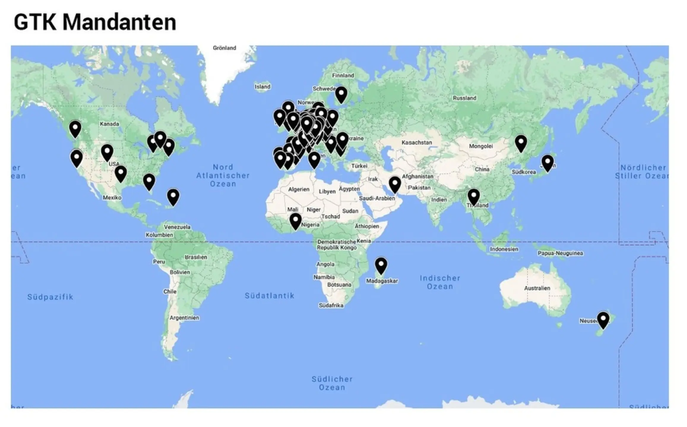 Hier wurden insbesondere unsere in diesem Jahr hinzugekommenen Mitarbeiterinnen und Mitarbeiter nochmals kurz vorgestellt. Anhand von vier Weltkarten wurde aufgezeigt, an welchen Standorten - inkl. 100% Homeoffice Stellen, die GTK tätig ist, welche Sprachen bei der GTK gesprochen werden und wo sich unsere Mandanten in Europa und weltweit verteilen.