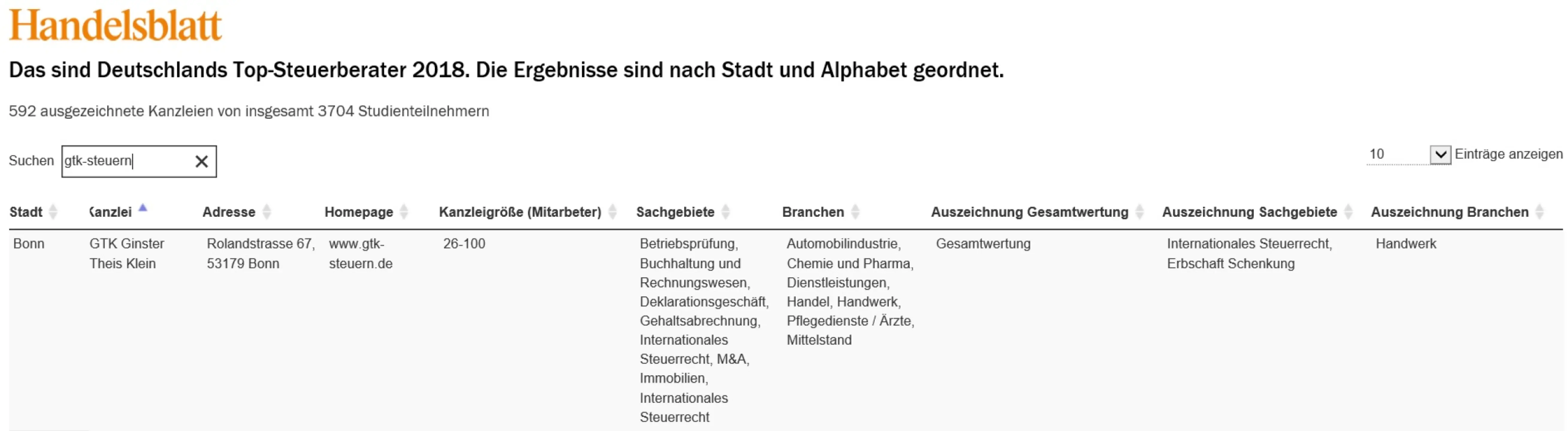 Jährlich kürt das Handelsblatt die Top-Steuerberater des Landes. Im Rahmen der durch das Hamburger Marktforschungsunternehmens S.W.I. Finance durchgeführten Studie wurde der