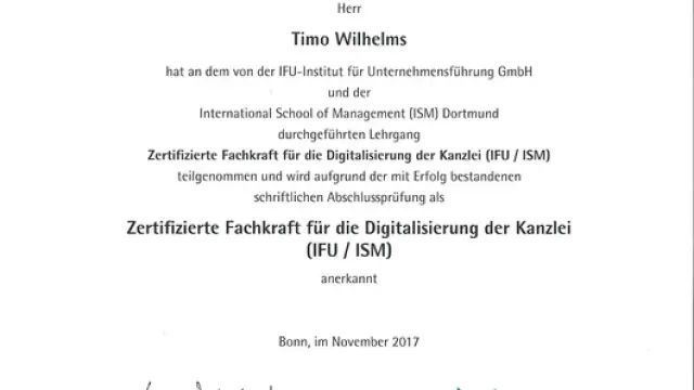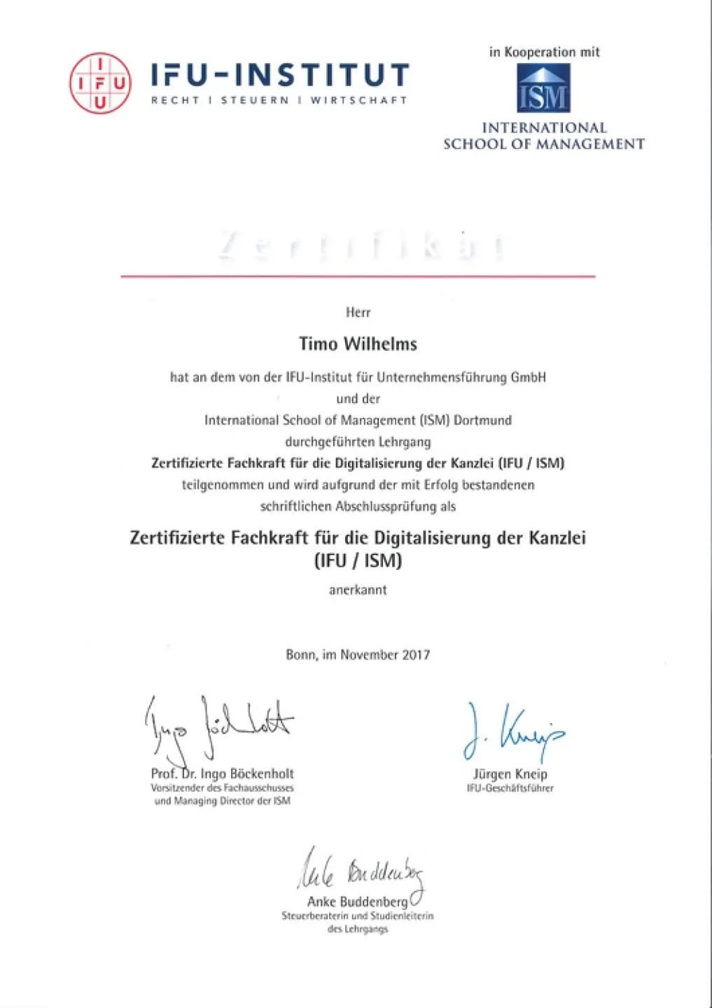 Um hier gut aufgestellt zu sein ist ständige Fortbildung unerlässlich. Unser Steuerfachangestellter Timo Wilhelms hat dazu kürzlich den Lehrgang "Zertifizierte Fachkraft für die Digitalisierung in der Kanzlei (IFU/ISM)" absolviert.